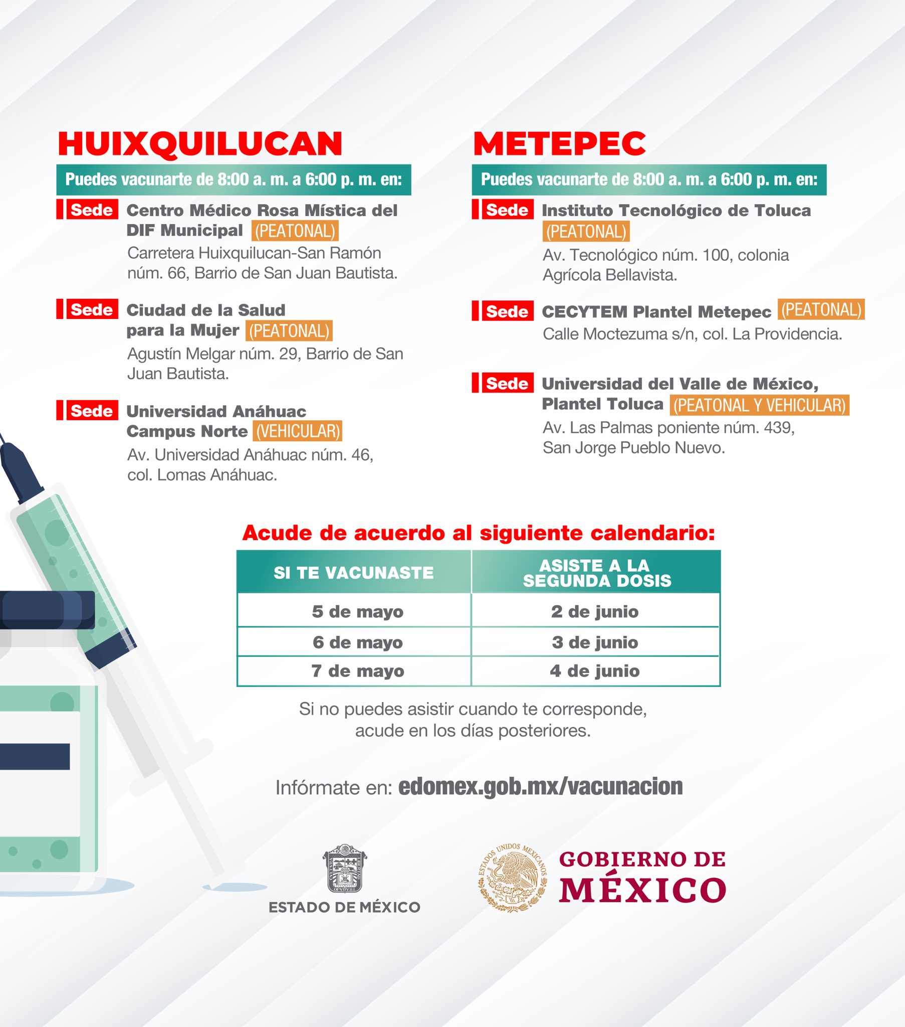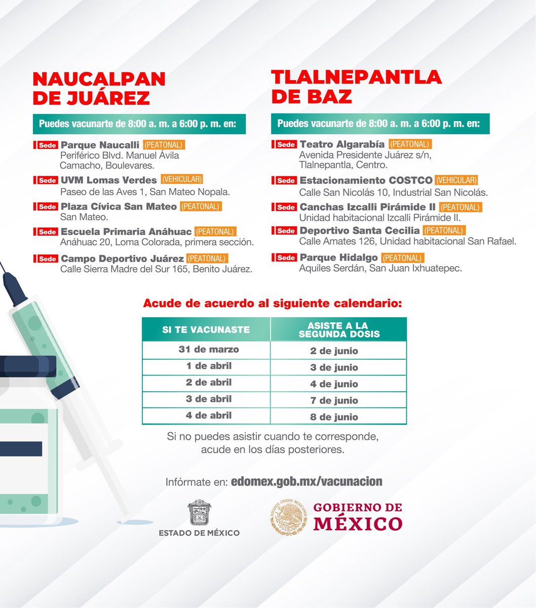 Alfredo Del Mazo On Twitter Del 2 Al 8 De Junio Estaremos Aplicando La Segunda Dosis A Los Adultos Mayores Y La Primera Dosis A Mujeres Embarazadas En Naucalpan Y Tlalnepantla Estrategiadevacunacion